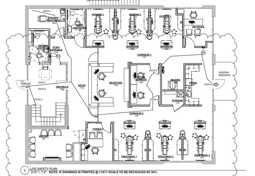 With sanitation and comfort naturally front of mind, Dr. Pahopos included a laundry room for his dental team so they can wash and dry their scrubs and other apparel without having to take them home. Air purifiers dot the space; every dental chair is equipped with massage settings to help put patients at ease. The renovation team turned the existing basement into a large staff lounge and conference room.