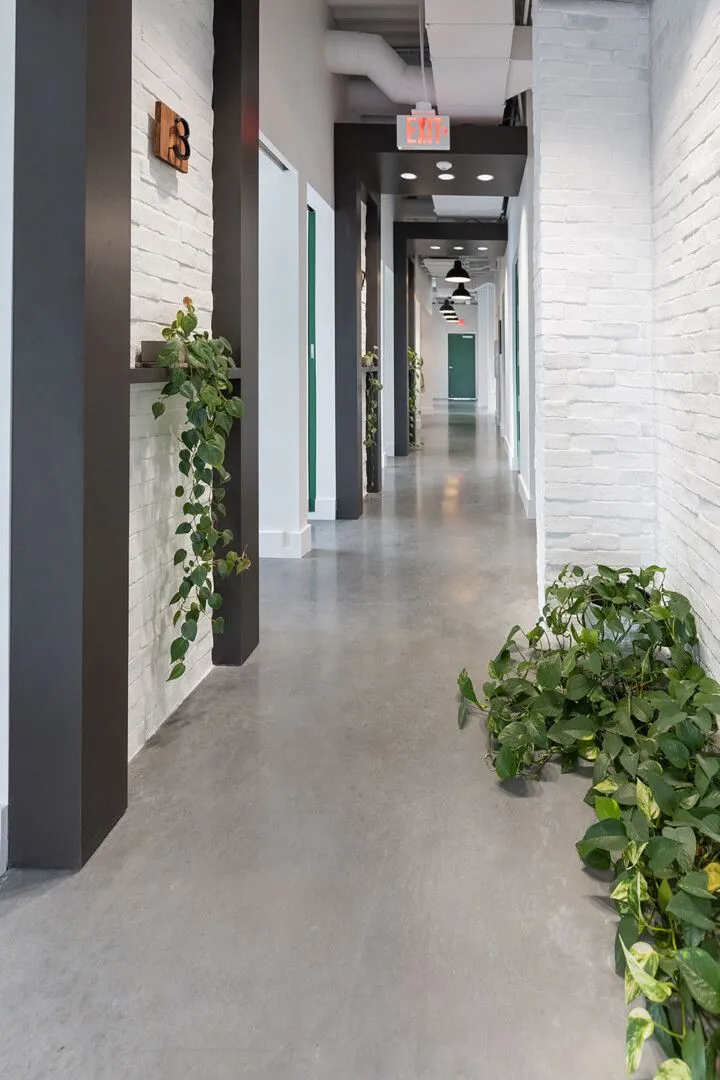 The interior is highlighted by cozy wooden tones and almost sensuous textures. Lush plant life thrives throughout the sunlit space (the floor-to-ceiling windows were a central design focus during planning and construction), while lashes of bright green paint and cheerful yellow fabric accents are reflected in the polished concrete flooring that runs throughout. Exposed ceilings displaying industrial ductwork and plumbing are offset by sleek hardware finishes.