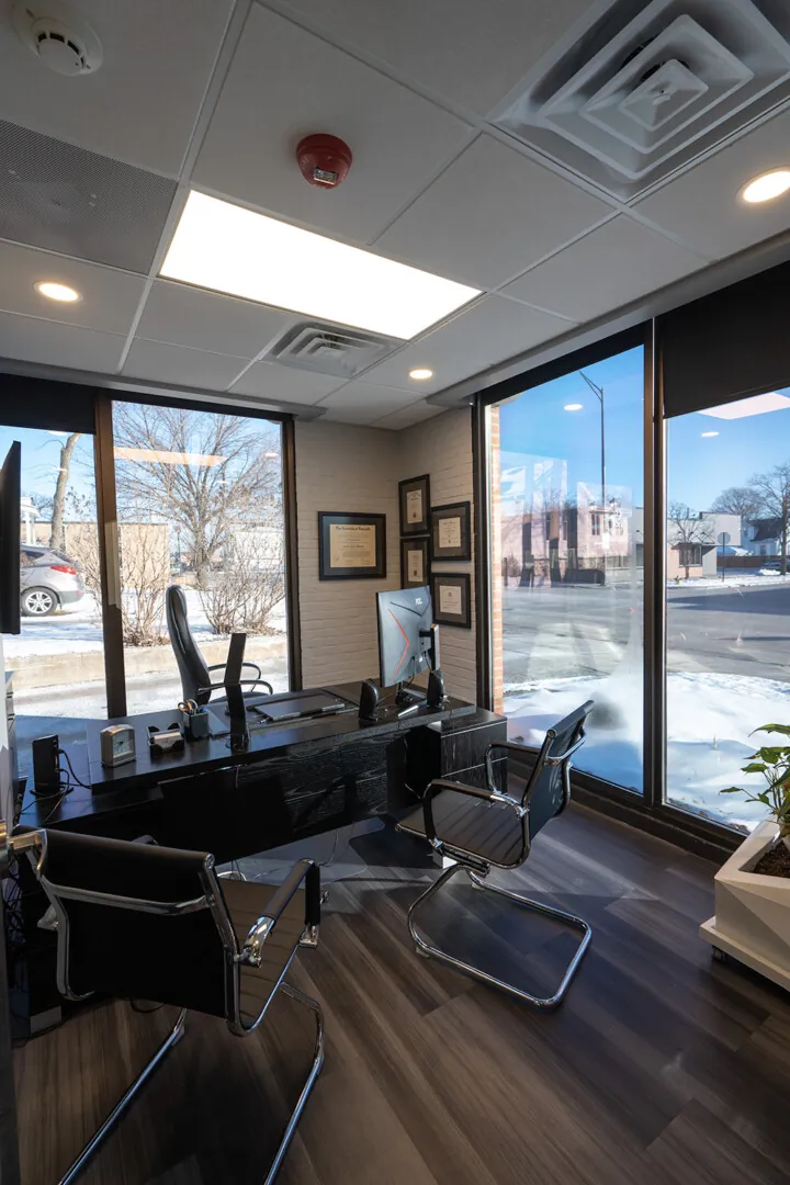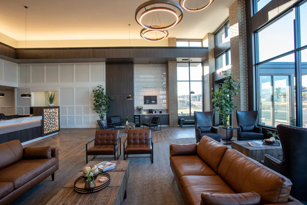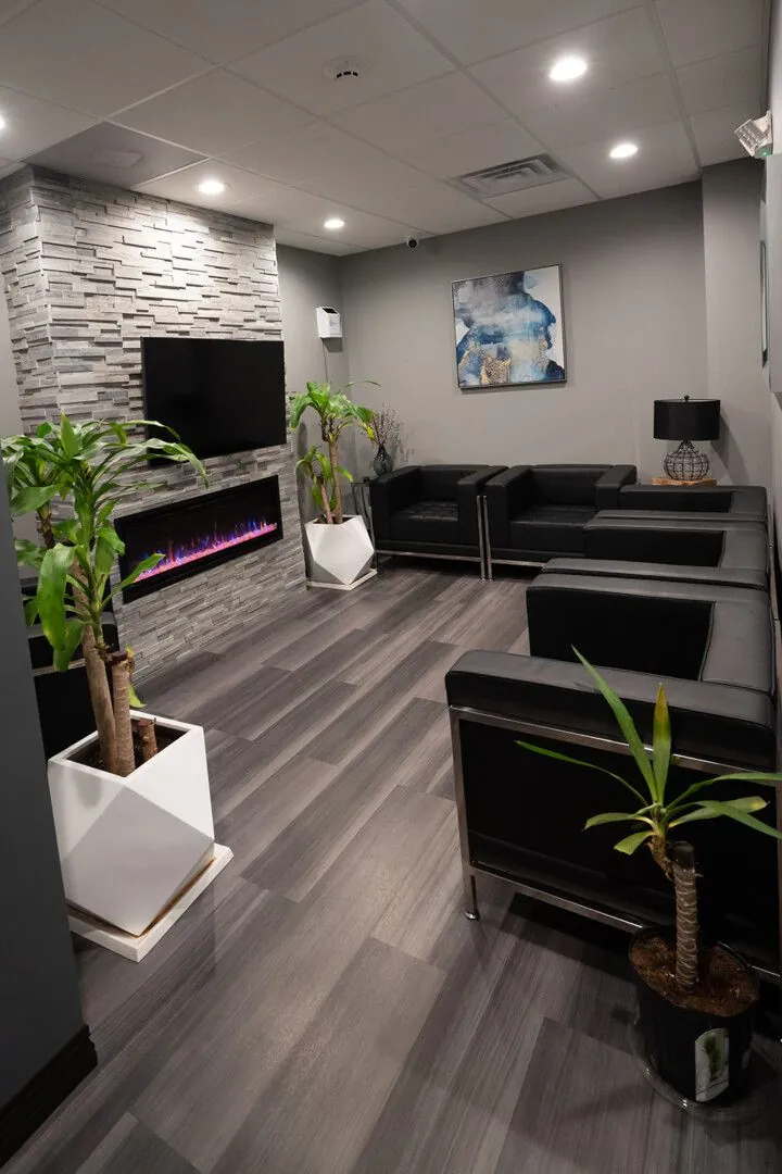 Elegant with a modern twist. The patterns from the wood floor and carpet in the waiting room contrast just the correct amount and give you a red-carpet-at-the-Oscars feel. Excellent design.”