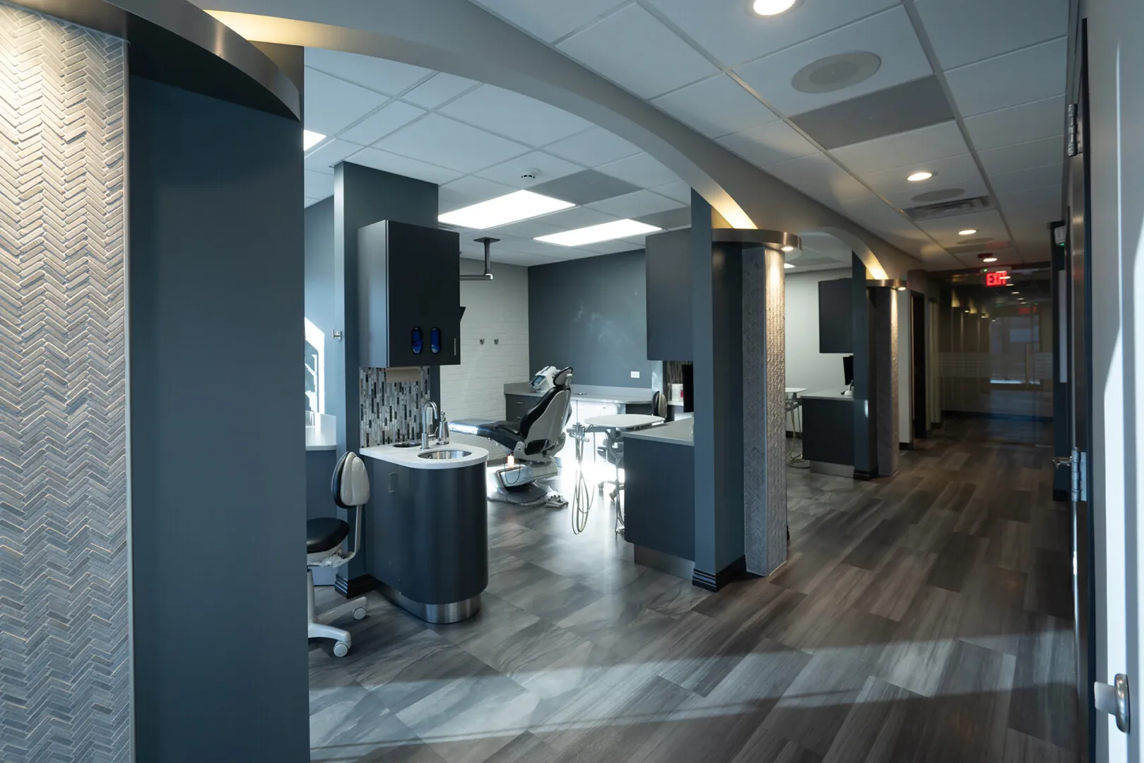 The modern vibe features shades of cool gray and blue, conjuring a sense of serene waters. Bursts of bright color, such as a pair of fabulous royal-blue velvet chairs in the reception area, provide a luxe counterpoint, while elements such as herringbone subway tile and exposed painted brick knit together an array of textures and dimensions. Natural light abounds, and archways—another nod to Greek influence—offer seamless transition from one area to another. The inviting reception area comes complete with a fireplace and beverage bar. (Note, too, the practice logo at the front desk; its swooping lines echo all those arches while forming the image of a tooth.)