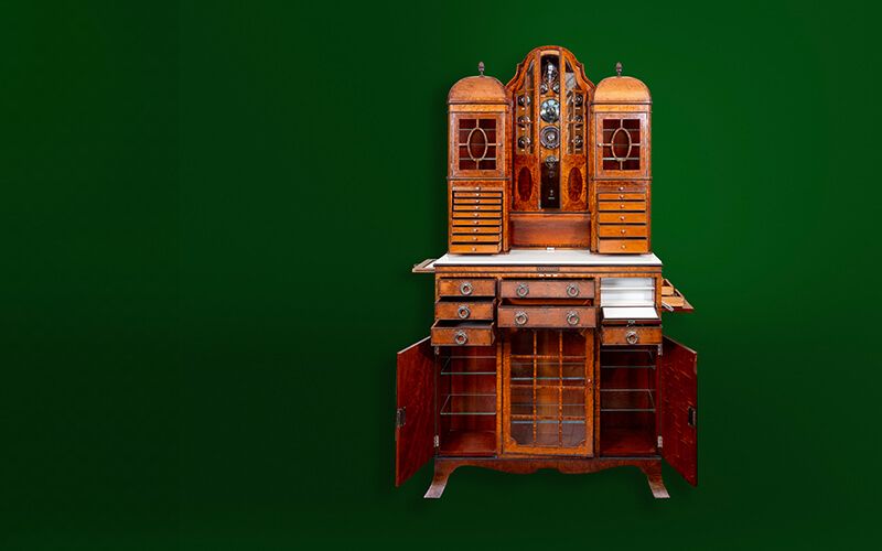 THIS ISN’T JUST a remarkably handsome dental cabinet. It was designed to serve as the electrical hub for an entire operatory, with integrated hookups and controls for a handpiece, light, lathe, sterilizer and more. According to a U.S.-based collector I know, this type of cabinet was big in Europe but never got traction in the States. Equally interesting: Every major part—from the switches and gauges to the fine woodwork—is stamped with the name of its maker, the Dental Manufacturing Co., Ltd. of London, indicating an impressive degree of vertical integration.