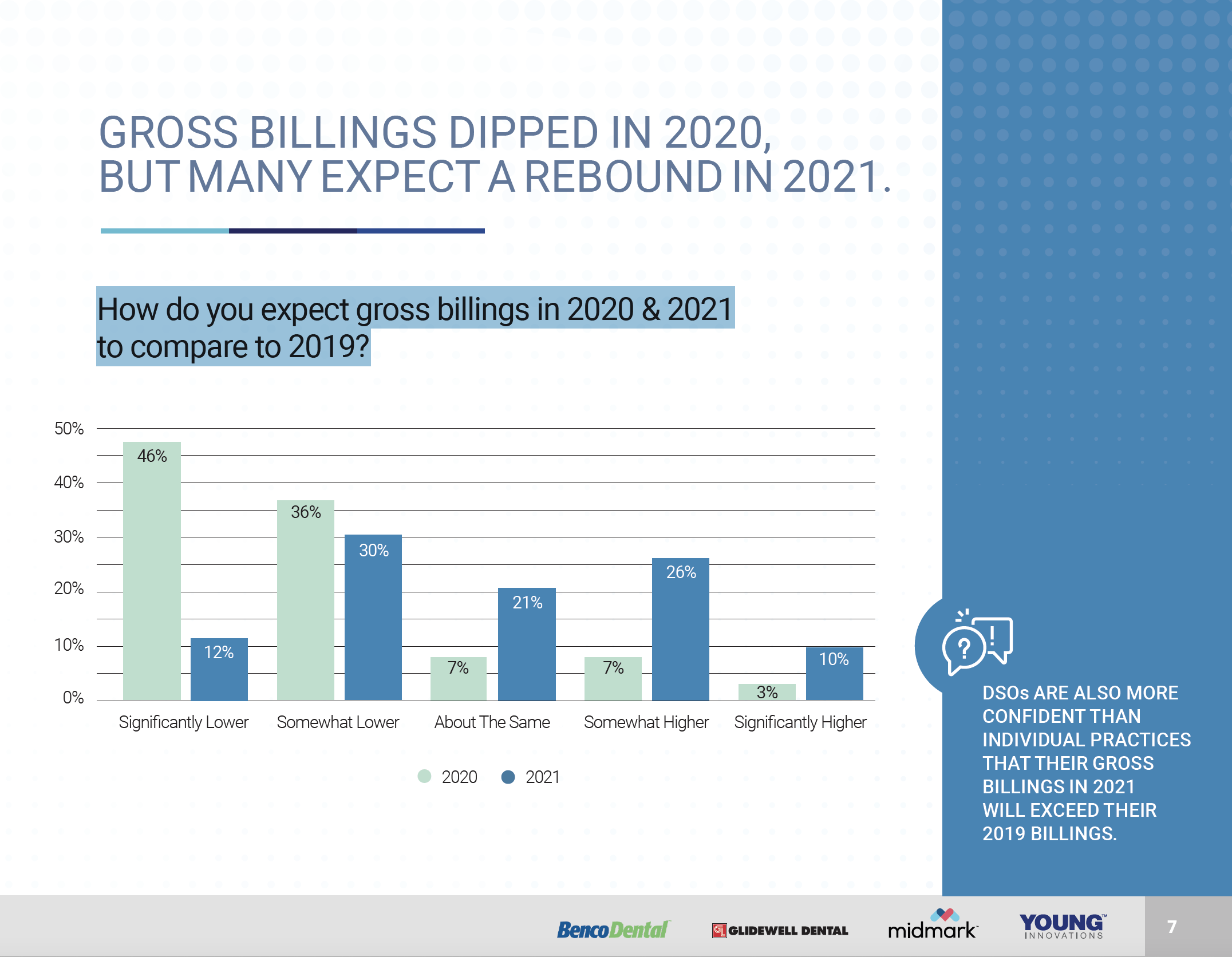 Dentists respond to the question, “How do you expect gross billings in 2020 & 2021 to compare to 2019?” in the inaugural State of Dentistry Report, just released, that analyzes compelling survey responses from 720 dentists and office managers in North America. Get a complete, by-the-numbers update, available for download here.