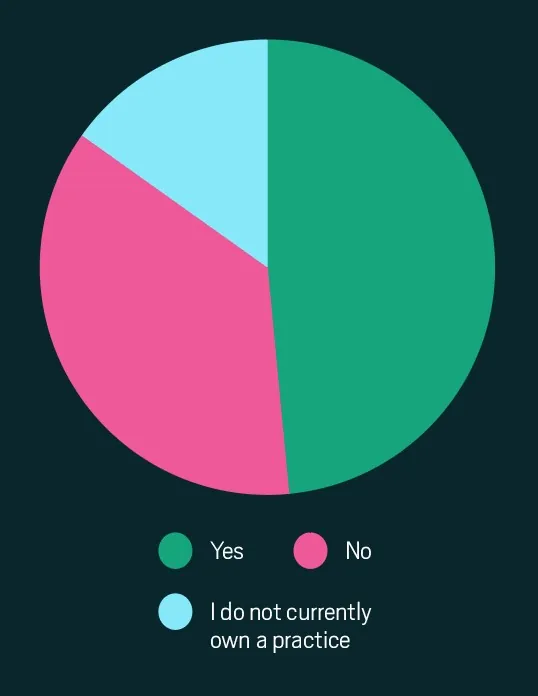 INCISAL EDGE SAYS: Around 15% of respondents don’t own a practice, but the rest do. A few decades ago, many of them would have relied on a practice sale to fund retirement, but not anymore. Nearly 37% aren’t counting on it, and over 30% of that group is under age 44. This suggests their earnings and investments feel sufficient to power their savings goals, with a practice sale seen as icing on the cake.