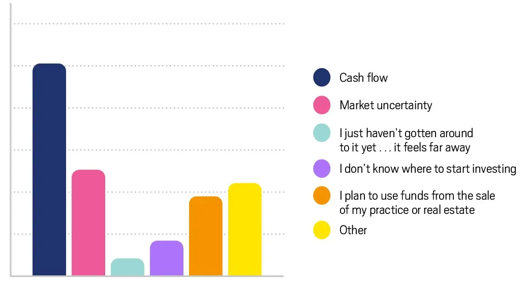 INCISAL EDGE SAYS: Over 50% cited insufficient cash flow, but market uncertainty is a hurdle as well. Many are still counting on a practice sale to help fund their retirement, but still others are simply having trouble getting started saving. The most common theme was that investing in their practice comes first. “Much of our cash has gone into investments in business and real estate, so it’s not liquid,” said one doctor in the Southwest. “In the next two years I’ll have most of my professional debt paid off, and as those loans sunset, I’ll be able to hypercharge cash/liquid.”