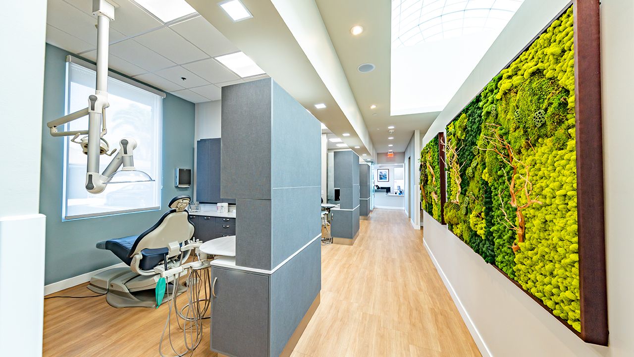 EVERY HUMAN SENSE will find something to pique its interest inside Dr. Mohamed A. Hassan’s Smiley Implants. There’s the visual and auditory rush of the enormous wall-mounted water fountain, the mood-elevating sunshine streaming through the 40-foot-long arched skylight and the beautiful sight and olfactory pop of the spectacular living wall, which helps organically purify the interior air. Medically the Riverside, California, space is a marvel as well: Dr. Hassan’s 2,800-square-foot periodontics and implant office features seven modern operatories, as well as a separate four-operatory practice for a general dentist next door.