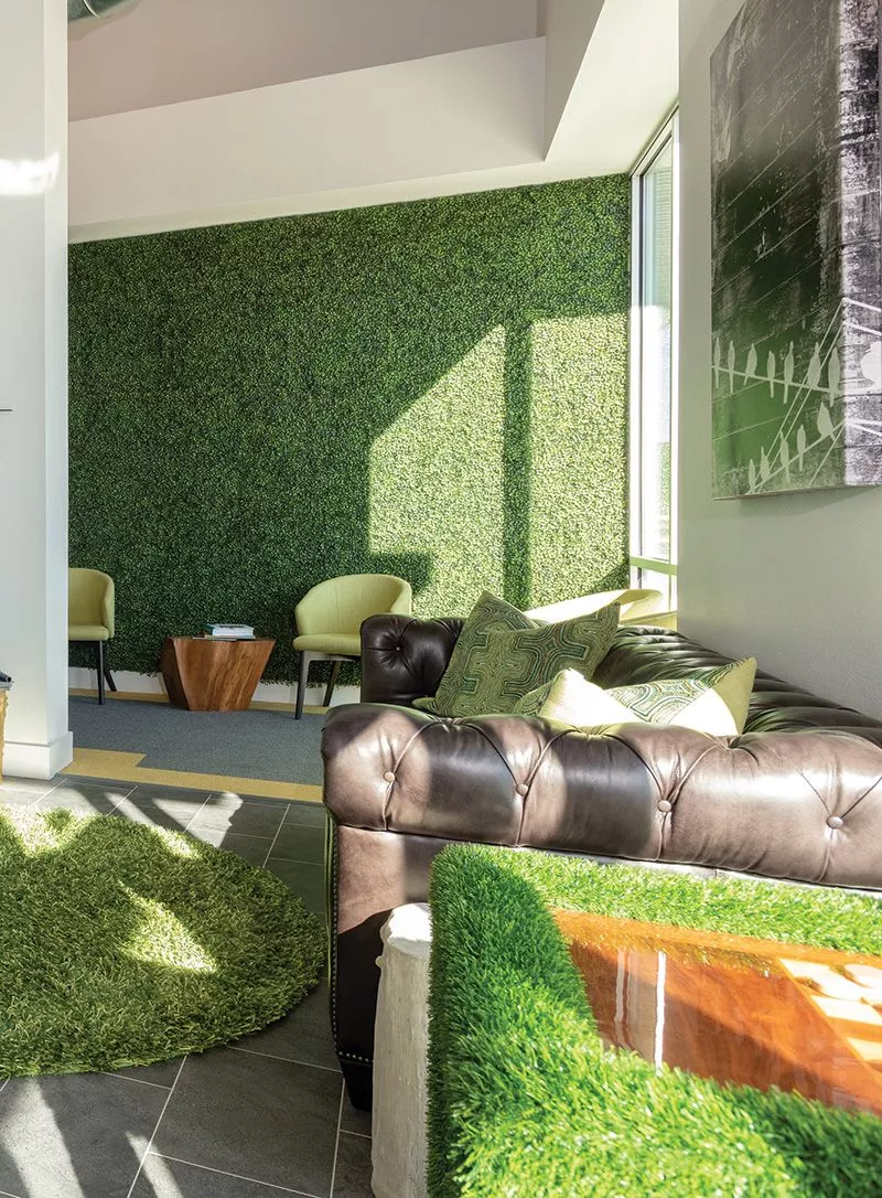 Working with Jim Reed and Jeff Harmon at Benco Dental, Dr. Wilson created a sophisticated yet whimsical, playful space loosely inspired by the high-rise apartments near Piedmont Park in Atlanta, where Dr. Wilson spent time with her kids at the beginning of 2019. The color scheme mixes calming green, upbeat yellow and gray; walls are garlanded with ivy for texture and an outdoorsy feel. “A lot of the design comes from a mom’s perspective,” she notes. “The layout is very open—I want moms and dads to feel like they can move around the office and follow their kids.”